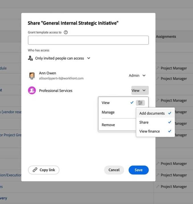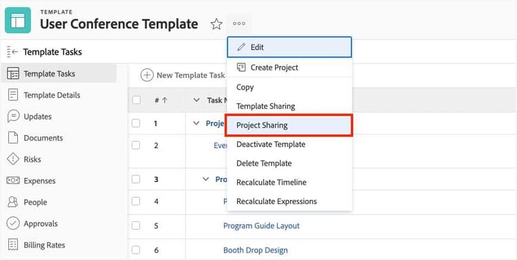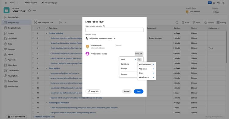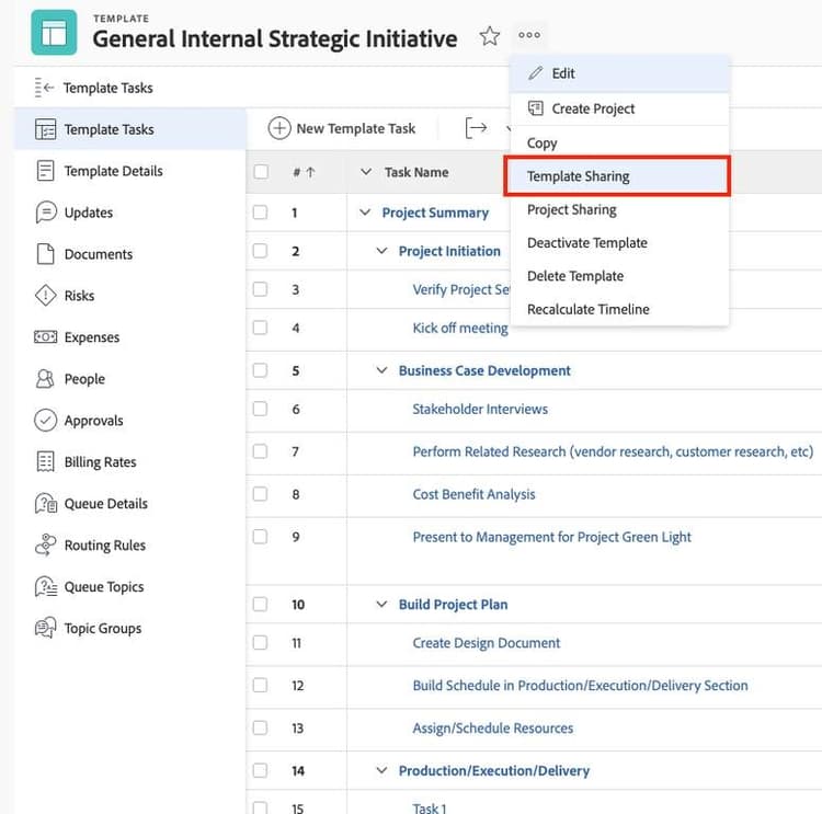 Gerencie permissões para permitir que os usuários editem o modelo. A Adobe Workfront recomenda limitar o número de pessoas que podem editar modelos para evitar alterações acidentais ou não aprovadas. Modelos bem construídos e consistentes são fundamentais para uma boa gestão de trabalho e relatórios precisos.