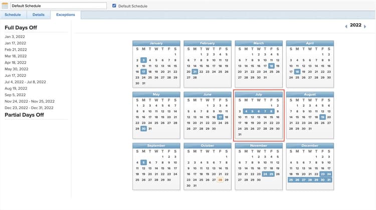 Na aba Exceções, marque feriados e outros dias de folga da empresa—ou seja, dias em que os usuários não estarão trabalhando.