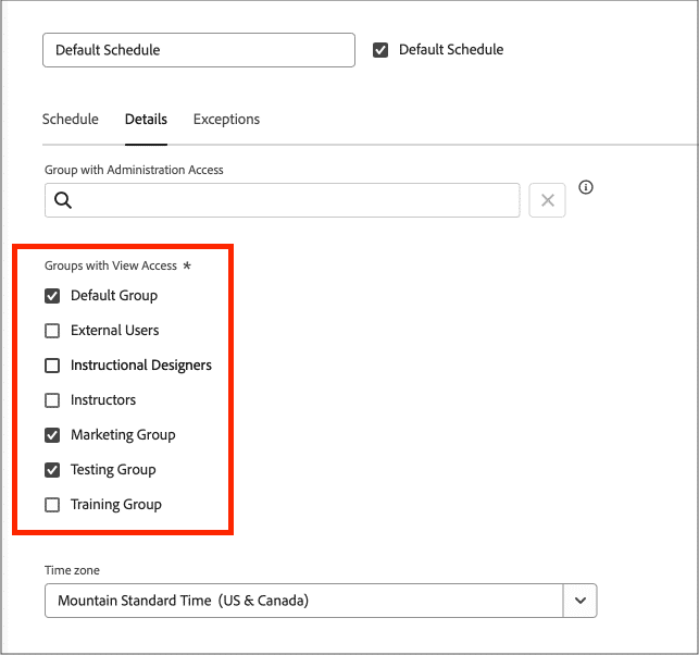 Na guia Detalhes, defina quais grupos do Adobe Workfront podem usar o cronograma.