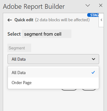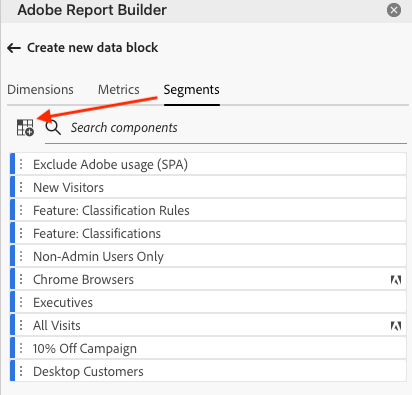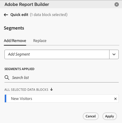 Você pode aplicar segmentos ao criar um novo bloco de dados ou ao selecionar a opção Editar bloco de dados no painel COMANDOS.
