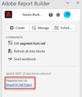 Quando você seleciona um intervalo de células na planilha, o link Segmentos no painel Edição rápida exibe uma lista de resumo dos segmentos usados pelos blocos de dados nessa seleção.