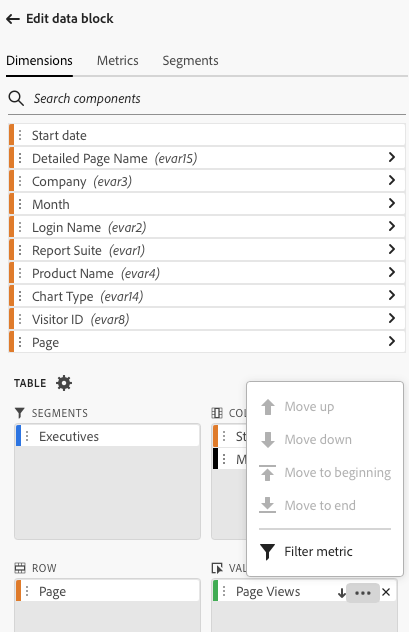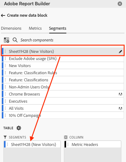 Para aplicar um segmento a todo o bloco de dados, clique duas vezes em um segmento ou arraste e solte os filtros da lista de componentes na seção Segmentos da Tabela.