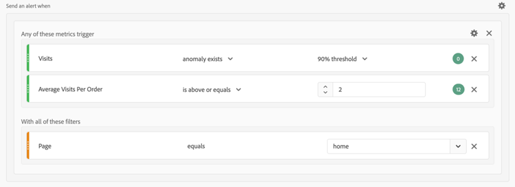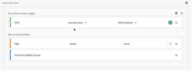 Você pode criar alertas simples usando segmentos. Por exemplo, defina um alerta sobre o número de sessões para pessoas que visitam a página inicial por meio de uma sessão de aplicativo móvel.