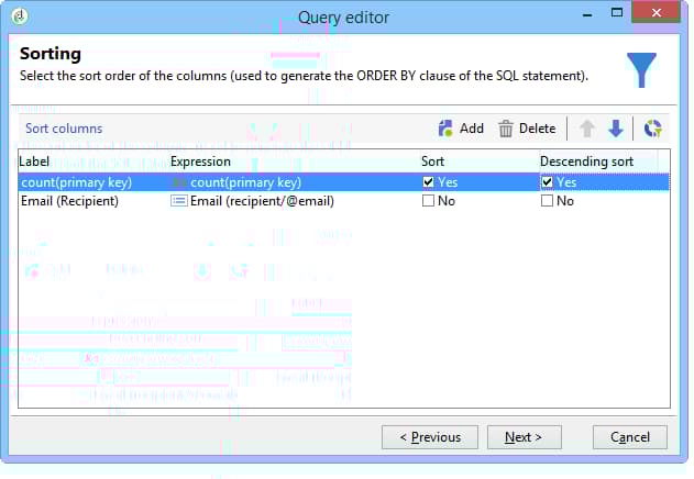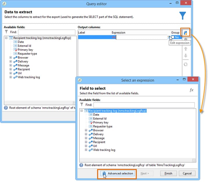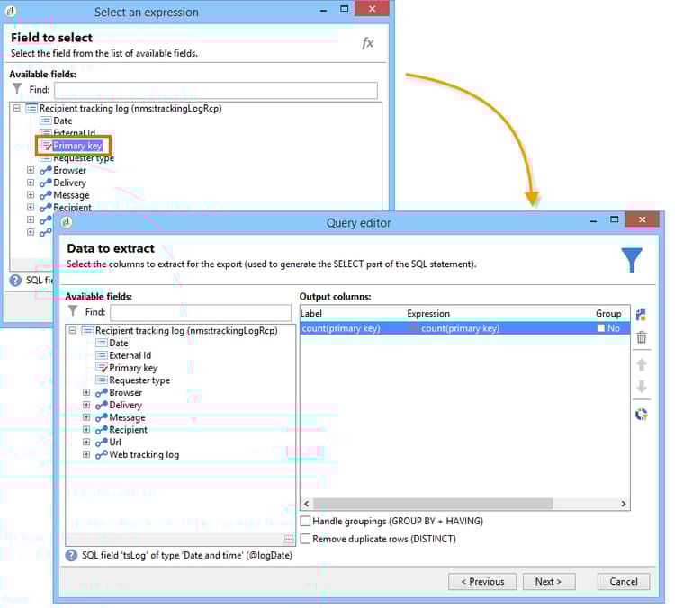 Na janela Data to extract, queremos criar uma agregação para coletar informações. Para fazer isso, adicione a chave primária (localizada acima do elemento principal de registros Recipient tracking logs). A contagem de log de rastreamento é realizada neste campo Primary key. A expressão editada será x=count(primary key). Ele vincula a soma de vários logs de rastreamento a um único endereço de e-mail.