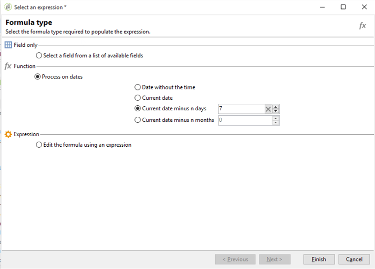 Selecione o operador less than. Na coluna Value, clique em Edit expression. Para o processamento de datas, vá para a janela Formula type, digite "1" em Current date minus n days.
