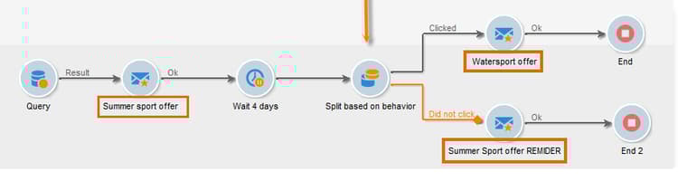 Uma entrega "Oferta esportiva de verão" é enviada. Quatro dias após a entrega, duas outras entregas são enviadas. Uma delas é "oferta de artigos de esportes aquáticos", o outro é uma continuidade da primeira entrega "oferta esportiva de verão".