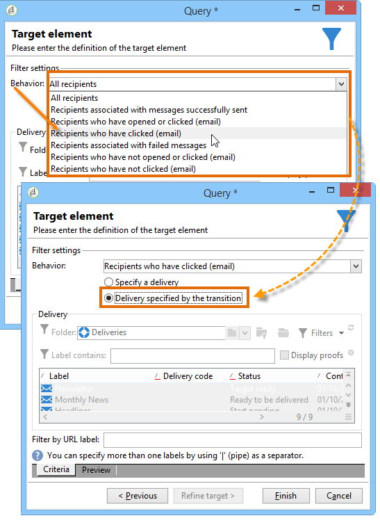Na janela Target element, selecione a comportamento Recipients who did not click (email). Selecione a opção Delivery specified by the transition como mostrado na última ramificação.