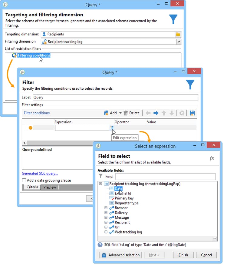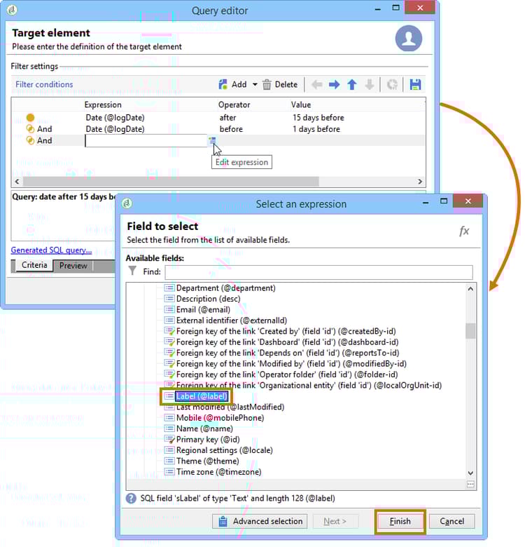 Na janela Target element, configure a data a partir da qual os logs de rastreamento serão considerados. Clique em Add. Uma linha de condição é exibida. Edite a coluna Expression ao clicar na função Edit expression. Na janela Field to select, selecione Date (@logDate).