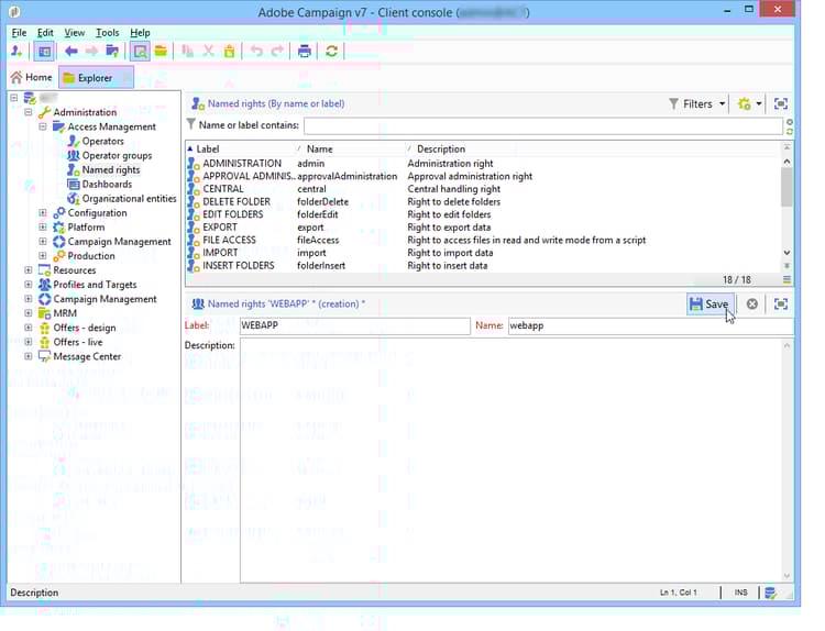 No nó Administration > Access management > Named rights, clique em New para criar um direito e nomeá-lo como WEBAPP.