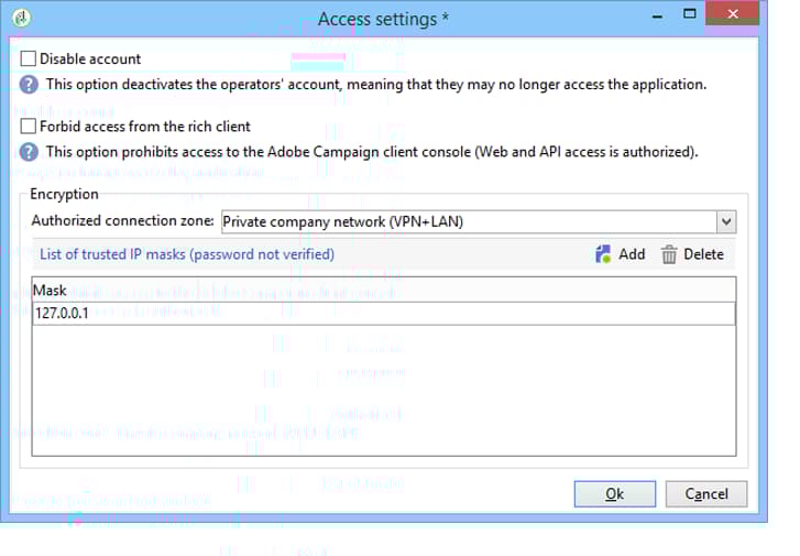 O operador poderá se conectar ao Adobe Campaign sem inserir a senha se o endereço IP estiver nessa lista.