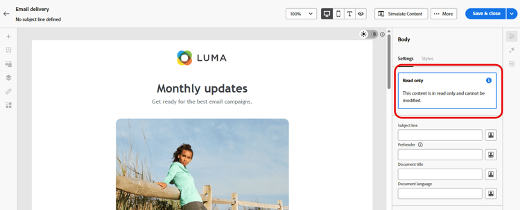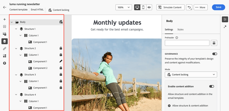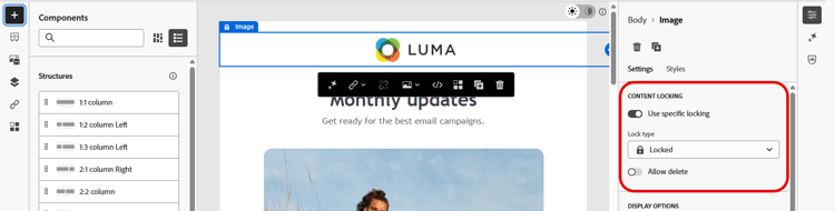 O Adobe Campaign permite bloquear o conteúdo em modelos de email, bloqueando todo o modelo ou estruturas e componentes específicos. Isso evita edições ou exclusões não intencionais, oferecendo maior controle sobre a personalização de modelos e melhorando a eficiência e a confiabilidade de suas campanhas de email.
