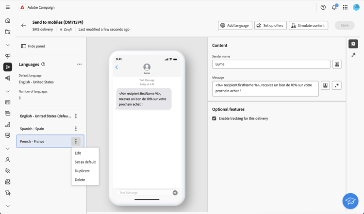 Na interface da Web do Campaign, você pode configurar seus deliveries como multilíngues, o que permite enviar mensagens com base no idioma preferencial de um perfil. Quando nenhuma preferência é definida, a mensagem é enviada no idioma padrão.