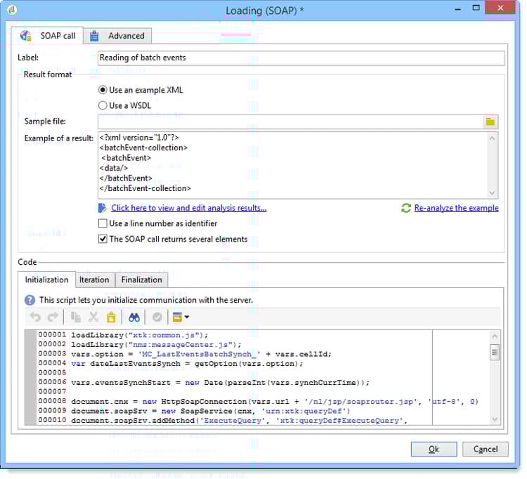 Iteration: executa a chamada para o serviço SOAP. O retorno dessa função deve ser um objeto XML compatível com a descrição do exemplo ou do WSDL.