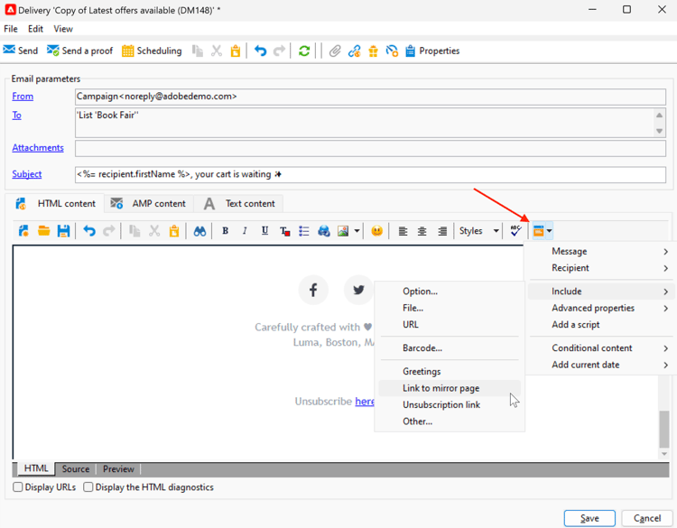 Adicione um bloco de personalização de mirror page no conteúdo do email. Saiba mais sobre blocos de personalização