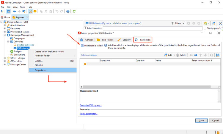 Na guia Restriction, selecione This folder is a view. Todas as entregas no banco de dados serão exibidos.