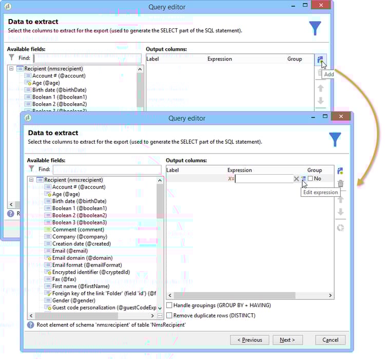 - Use o botão Add (acima da barra de ícones lateral) para adicionar uma coluna de saída na qual editaremos a expressão. Para obter mais informações sobre como editar uma expressão, consulte esta seção.