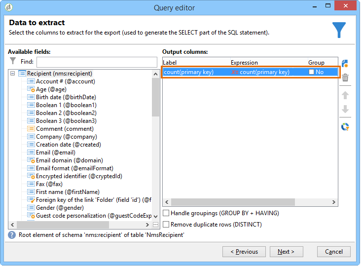 Clique duas vezes em um campo disponível para adicioná-lo às colunas de saída. No final da query, cada campo selecionado cria uma coluna na janela Data preview.