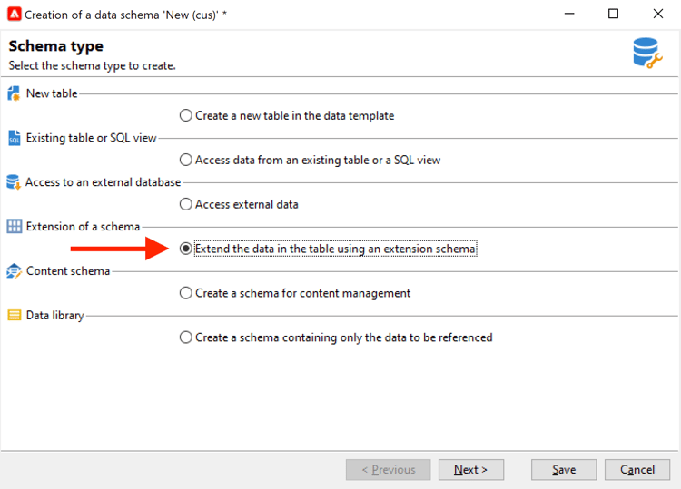 Clique no botão Novo e selecione Extend the data in a table using an extension schema.
