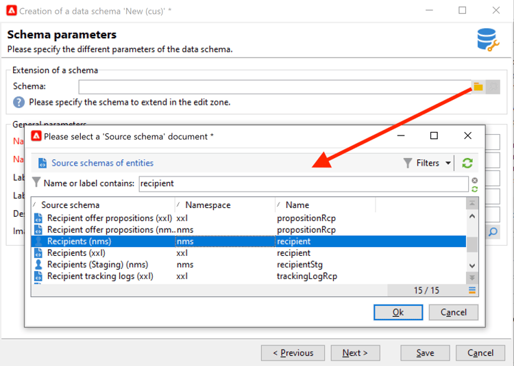 Identifique o esquema incorporado que será estendido e selecione-o.