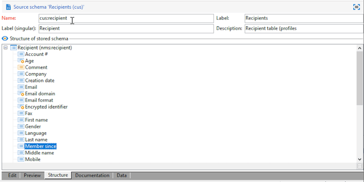 code language-none <srcSchema created="YYYY-MM-DD" desc="Recipient table" extendedSchema="nms:recipient" img="nms:recipient.png" label="Recipients" labelSingular="Recipient" lastModified="YYYY-MM-DD" mappingType="sql" name="recipient" namespace="cus" xtkschema="xtk:srcSchema"> <element desc="Recipient table" img="nms:recipient.png" label="Recipients" labelSingular="Recipient" name="recipient"> <attribute label="Member since" name="MembershipYear" type="long"/> <attribute length="50" name="lastName"/> <attribute _operation="delete" name="birthDate"/> </element> </srcSchema> -