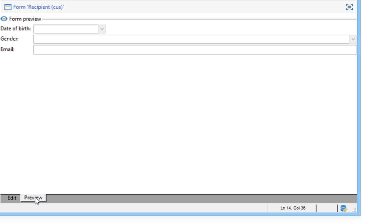 Por padrão, um formulário é associado ao schema de dados com o mesmo nome e namespace. Para associar um formulário a um nome diferente, defina o atributo entity-schema do elemento <form> como o nome da chave do esquema. Para ilustrar a estrutura de um formulário de entrada, descrevamos uma interface usando o schema de exemplo "cus:recipient":