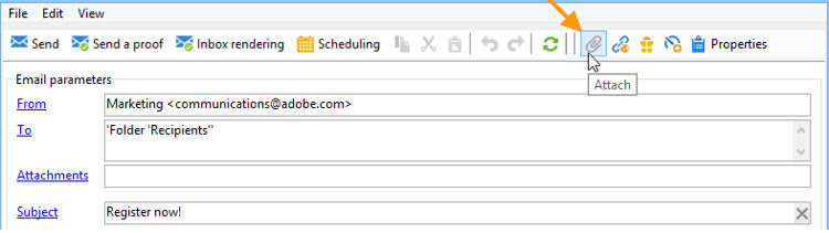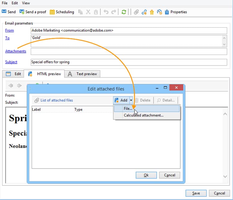 - Personalize o conteúdo do anexo para cada destinatário. Nesse caso, você precisa criar um anexo calculado: o nome do anexo é computado no momento da entrega de cada mensagem, dependendo do destinatário. O conteúdo também pode ser personalizado e convertido em formato PDF no momento da entrega, se você tiver a opção Impressão digital de variáveis.