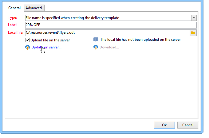 Se o anexo for um arquivo local, selecione a opção: File name is specified when creating the delivery template. O arquivo é selecionado no local e carregado no servidor. Siga as etapas abaixo: