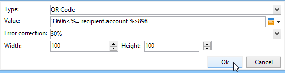note note NOTE O valor atribuído a um código de barras depende do seu tipo. Por exemplo, um tipo EAN-8 deve ter exatamente 8 números. O botão de personalização à direita do campo Value também permite adicionar dados, além do valor. Isso enriquece o código de barras, desde que o padrão do código de barras o aceite. Por exemplo, se estiver usando um código de barras do tipo GS1-128 e quiser inserir o número da conta de um destinatário, além do valor, clique no botão de personalização e selecione Recipient > Account number. Se o número da conta do destinatário selecionado for inserido corretamente, ele será considerado pelo código de barras.