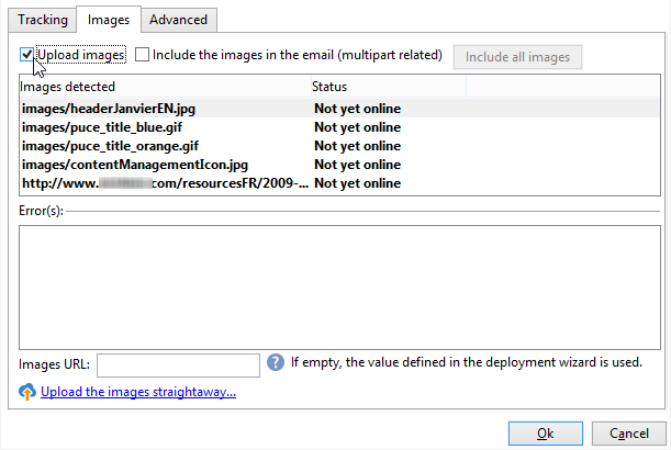 Você pode trabalhar com antecedência e carregar imagens para que elas possam ser visualizadas por outros operadores do Adobe Campaign. Isso pode ser útil se você trabalhar de forma colaborativa. Para fazer isso, clique em Upload the images straightaway… para fazer upload das imagens no servidor.