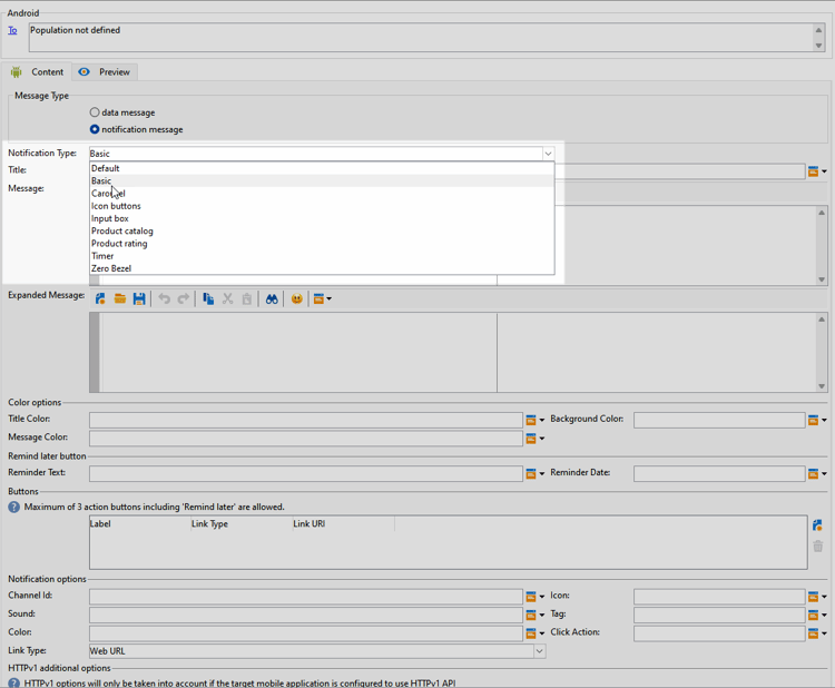 Para personalizar ainda mais sua notificação por push, configure o Notification options e o HTTPv1 additional options de sua notificação por push. Saiba mais
