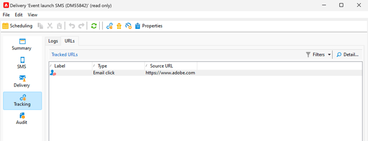 A guia Tracking é sobre o rastreamento. Abaixo o exemplo de um URL rastreado no conteúdo do SMS.