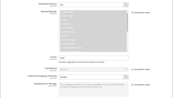 All Allowed Countries- Clientes de todos os países especificados na sua configuração de loja podem usar este método de envio.Specific Countries - Depois de escolher esta opção, a lista Ship to Specific Countries é exibida. Selecione cada país na lista onde este método de envio pode ser usado.No.Yes- A opção de envio FedEx é exibida na lista de métodos de entrega, independentemente do pedido se qualificar para usá-lo.No - A opção de envio FedEx não será exibida na lista de métodos de entrega se não for aplicável ao pedido (por exemplo, se o peso do pedido exceder o valor máximo de peso).0 no início da lista.DHL