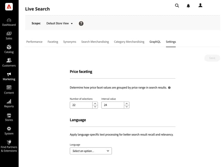 Use o espaço de trabalho Configurações para configurar os intervalos e os intervalos de facetas de preços e o idioma padrão do índice.
