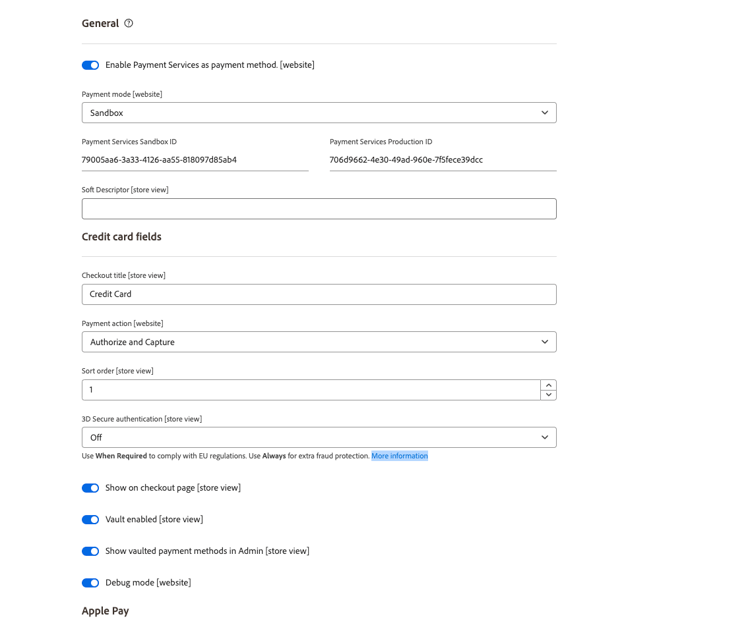 Os valores Payment Services Sandbox ID e Payment Services Production ID são preenchidos automaticamente depois que você configura o Commerce Services Connector e visita o painel Payment Services pela primeira vez. Faça isso para concluir a integração dos ambientes de sandbox e/ou produção. Esses valores associam sua SaaS ID a Payment Services.