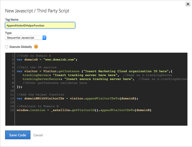 Observação: carregue o Serviço de ID de Marketing Cloud VisitorAPI.js 1.8.0 ou superior no Serviço de ID de Marketing Cloud do DTM nos domínios de origem e de destino. Os testes devem ser feitos em situações de navegador que bloqueiam cookies para validar a funcionalidade.