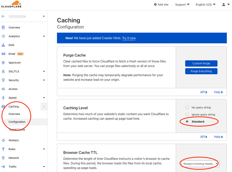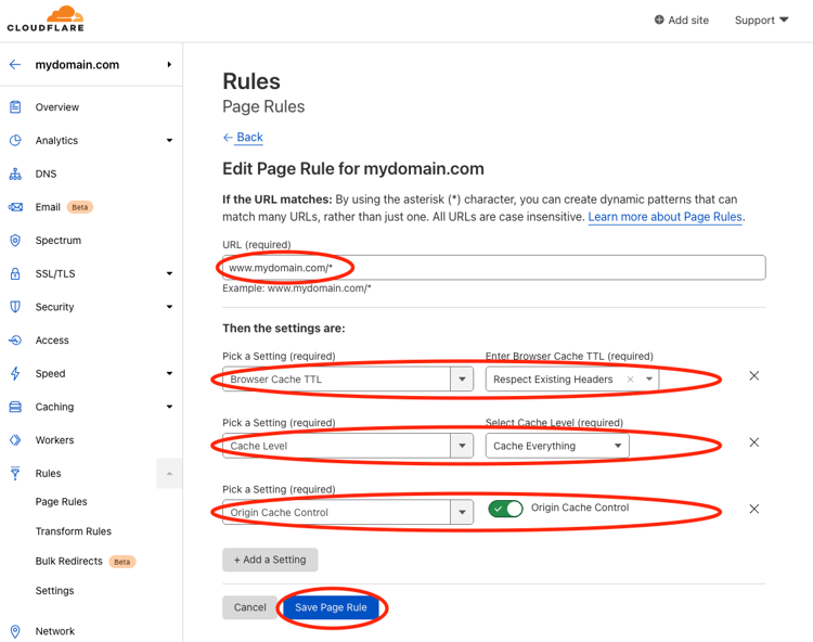 As capturas de tela a seguir ilustram como configurar o Cloudflare usando a interface de linha de comando wrangler para fornecer conteúdo do AEM. As configurações essenciais são marcadas com um círculo vermelho.