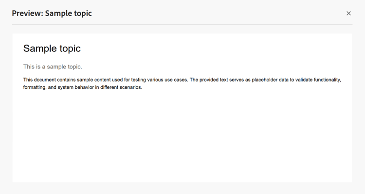 Depois que um tópico é criado, o Adobe Experience Manager Guides gera uma pré-visualização do tópico. O modo de Visualização fornece vários recursos que você pode usar para trabalhar com o documento.