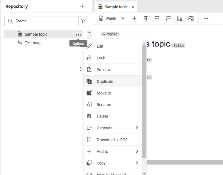 - Abra o tópico para edição no Editor. A opção Editar não estará disponível se o administrador tiver habilitado a opção Desabilitar edição sem bloquear o arquivo. Com a opção habilitada, você exibirá a opção Editar somente após bloquear um arquivo de tópico.