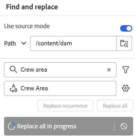 note note NOTE Para habilitar o ícone Substituir tudo, o administrador do perfil de pasta ou o administrador do sistema deve selecionar a opção Habilitar Substituir tudo na guia Geral das configurações do Workspace (exibidas como Configurações para No local). Se ocorrerem erros durante a operação de substituição, esses arquivos serão ignorados devido a problemas de análise XML ou erros relacionados a DITA. {width="350"}