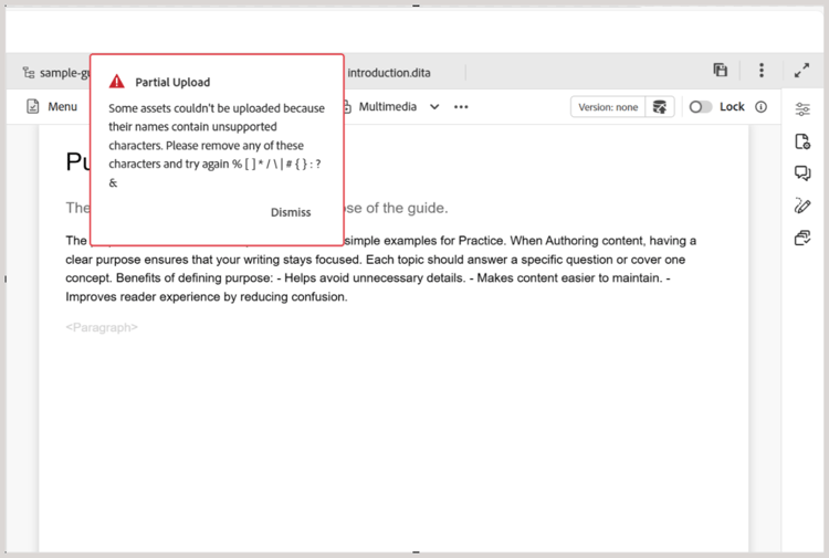 Carregar ativos: carregue um arquivo do sistema local para a pasta selecionada no repositório do Adobe Experience Manager. Você também pode arrastar e soltar arquivos do seu sistema local no tópico de trabalho atual. Isso é muito útil se você quiser inserir imagens do sistema local no tópico.