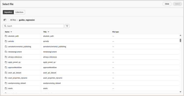 Na caixa de diálogo Reutilizar conteúdo, selecione o arquivo DITA para referências de arquivo ou o arquivo de mapa DITA que contém as referências principais. Depois de selecionada, o tópico ou as referências de chave são mostrados na caixa de diálogo. Você pode selecionar a ID/chave do tópico que deseja inserir e selecionar Concluído para inserir o conteúdo no seu tópico.