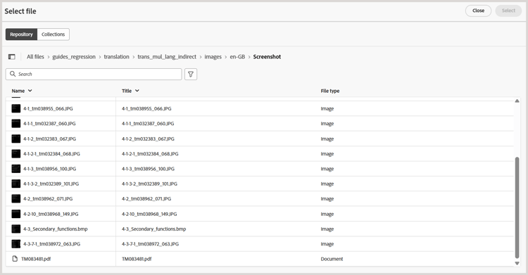 Na caixa de diálogo Selecionar arquivo, você pode procurar o arquivo de imagem necessário de Repositório ou Coleções.