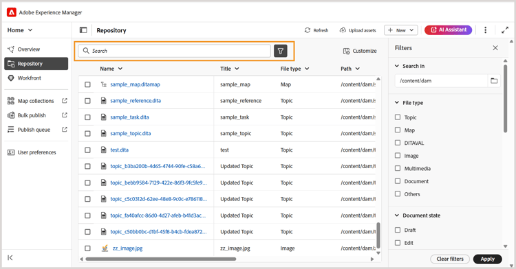 Tipo de arquivo: filtre sua pesquisa com base em um tipo de arquivo específico. Opções disponíveis: Tópico, Mapa, DITAVAL, Imagem, Multimídia, Documento e Outros.