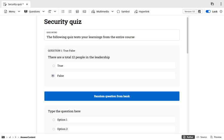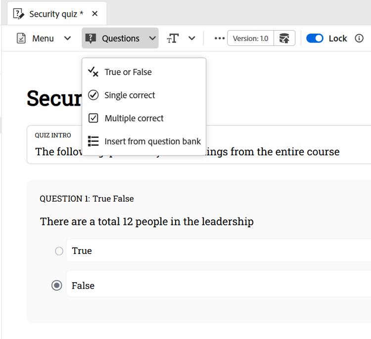 Selecione a opção Inserir do banco de perguntas no menu suspenso Perguntas, na barra de ferramentas, conforme mostrado abaixo.