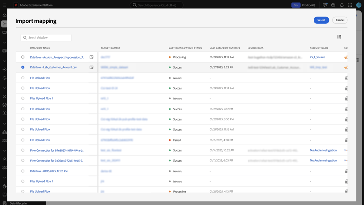 Em seguida, use a janela pop-up para localizar o fluxo de dados cujo mapeamento você deseja importar. Durante essa etapa, você também pode usar a função de pesquisa para isolar um fluxo de dados específico e recuperar seus mapeamentos. Quando terminar, selecione Select.