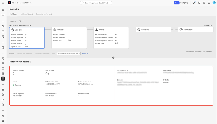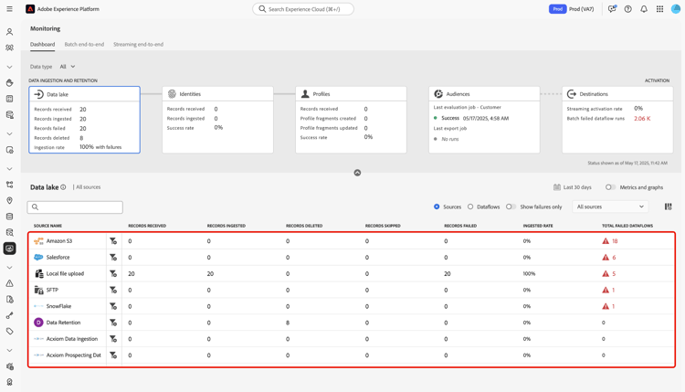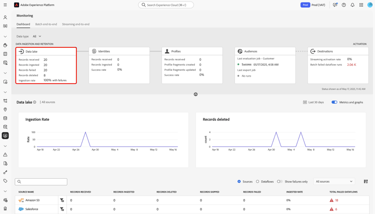 Você pode usar o painel de monitoramento na interface do usuário do Adobe Experience Platform para recuperar métricas sobre os processos de assimilação e retenção de dados no data lake. Use os gráficos na interface para monitorar as tendências de assimilação e retenção ao longo do tempo e resumir o desempenho em todos os fluxos de dados de suas origens.