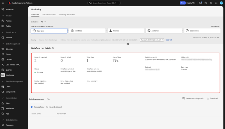 Use a seção Records failed para exibir métricas em registros que não foram assimilados devido a erros. Para exibir um relatório de erros abrangente, selecione Preview error diagnostics. Para baixar uma cópia do diagnóstico de erros e do manifesto de arquivo, selecione Download e copie a chamada de API de exemplo a ser usada com a API Data Access.