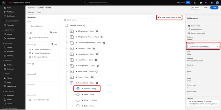 Altere os nomes de campos para os nomes para exibição alterando para Show display names for fields. Para editar o nome de exibição de um campo de esquema, selecione o campo na tela. No painel direito, forneça o novo nome em Display name.