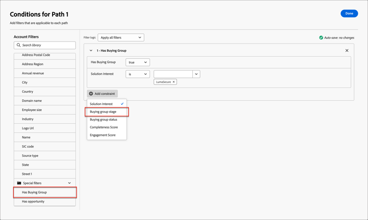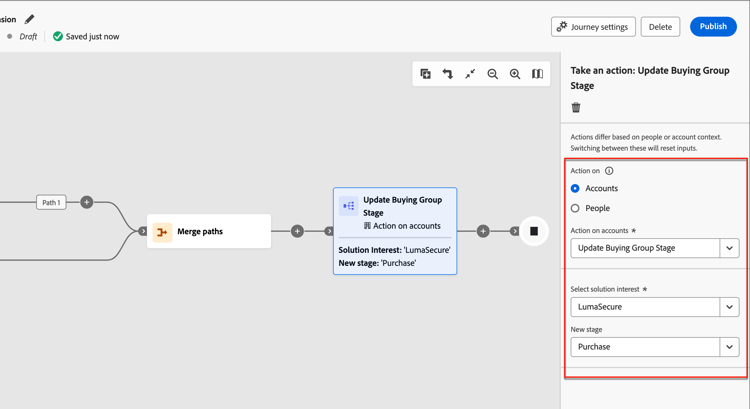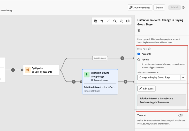 Use a ocorrência de uma alteração de estágio de grupo de compra para mover a conta para a próxima etapa da jornada. A definição desse nó envolve a seleção do interesse da solução e restrições adicionais para atender ao acionador do evento.