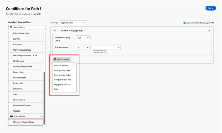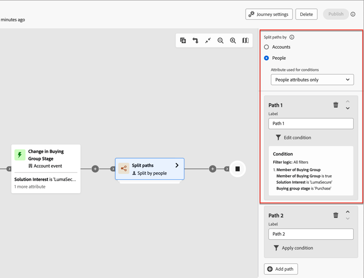 Usando um nó de caminho dividido, você pode filtrar no nível de conta ou no nível de pessoas de acordo com estágios de grupo de compra. Por exemplo, adicione um estágio de grupo de compra como uma condição de caminho ao dividir caminhos por membro do grupo de compra.